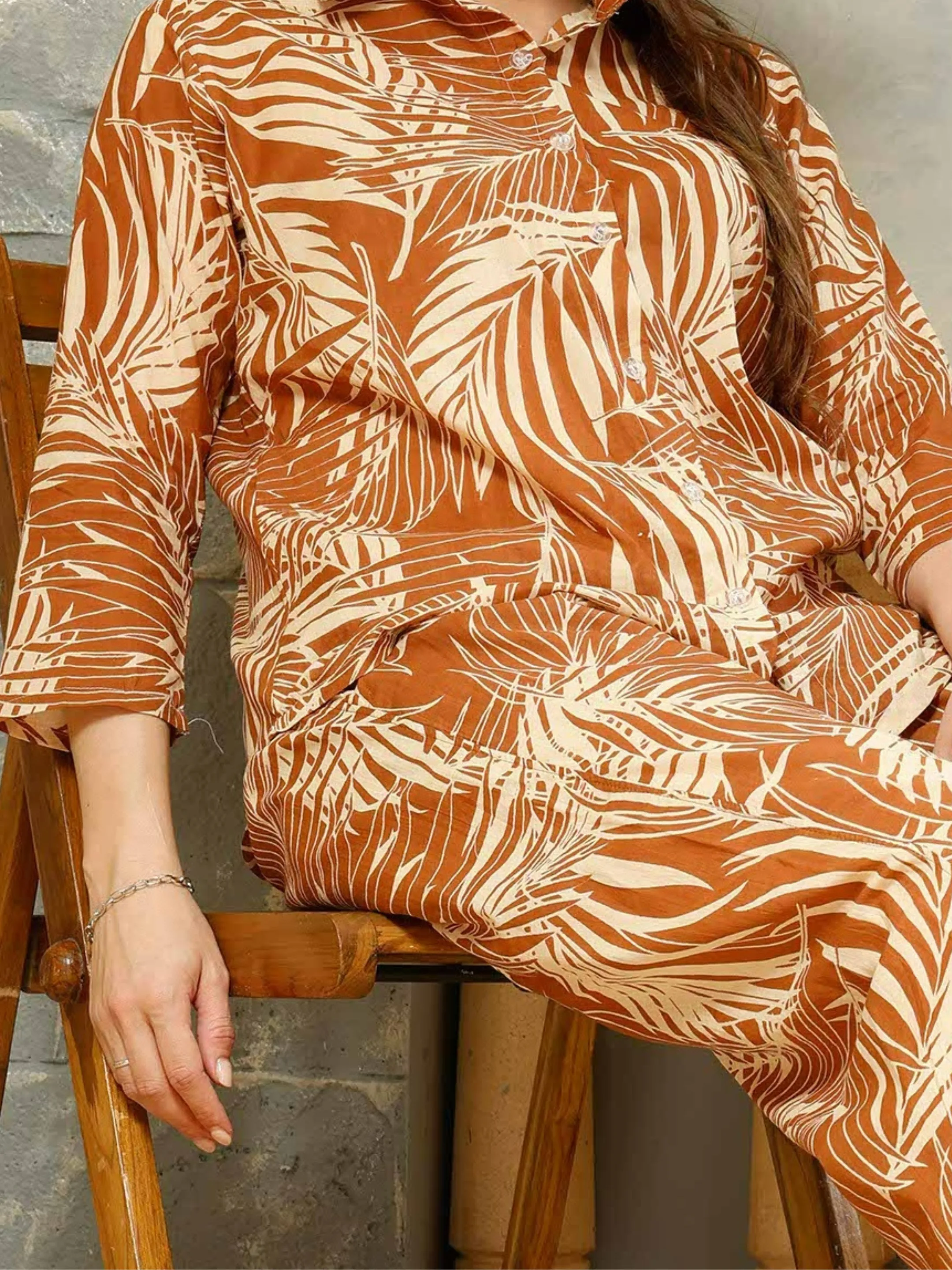 Pairing a rust shade leaf printed shirt with a matching pajama cord set sounds like a stylish and coordinated choice! This combination can create a visually appealing, cohesive look that’s both fresh and comfortable.