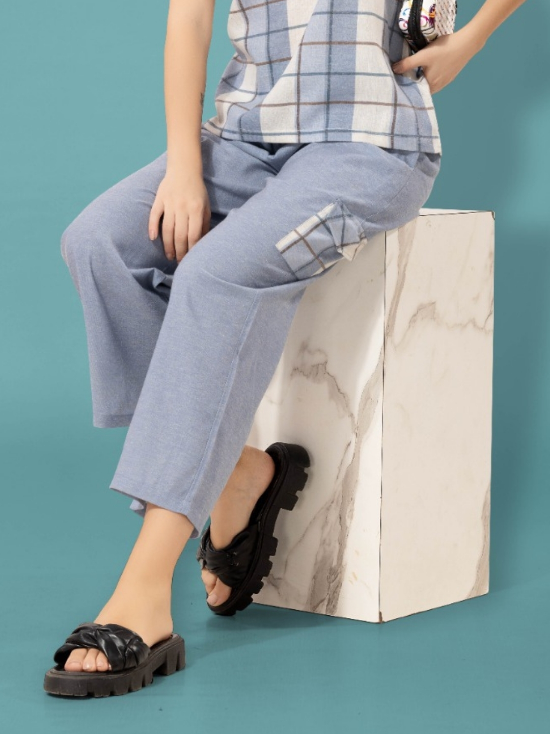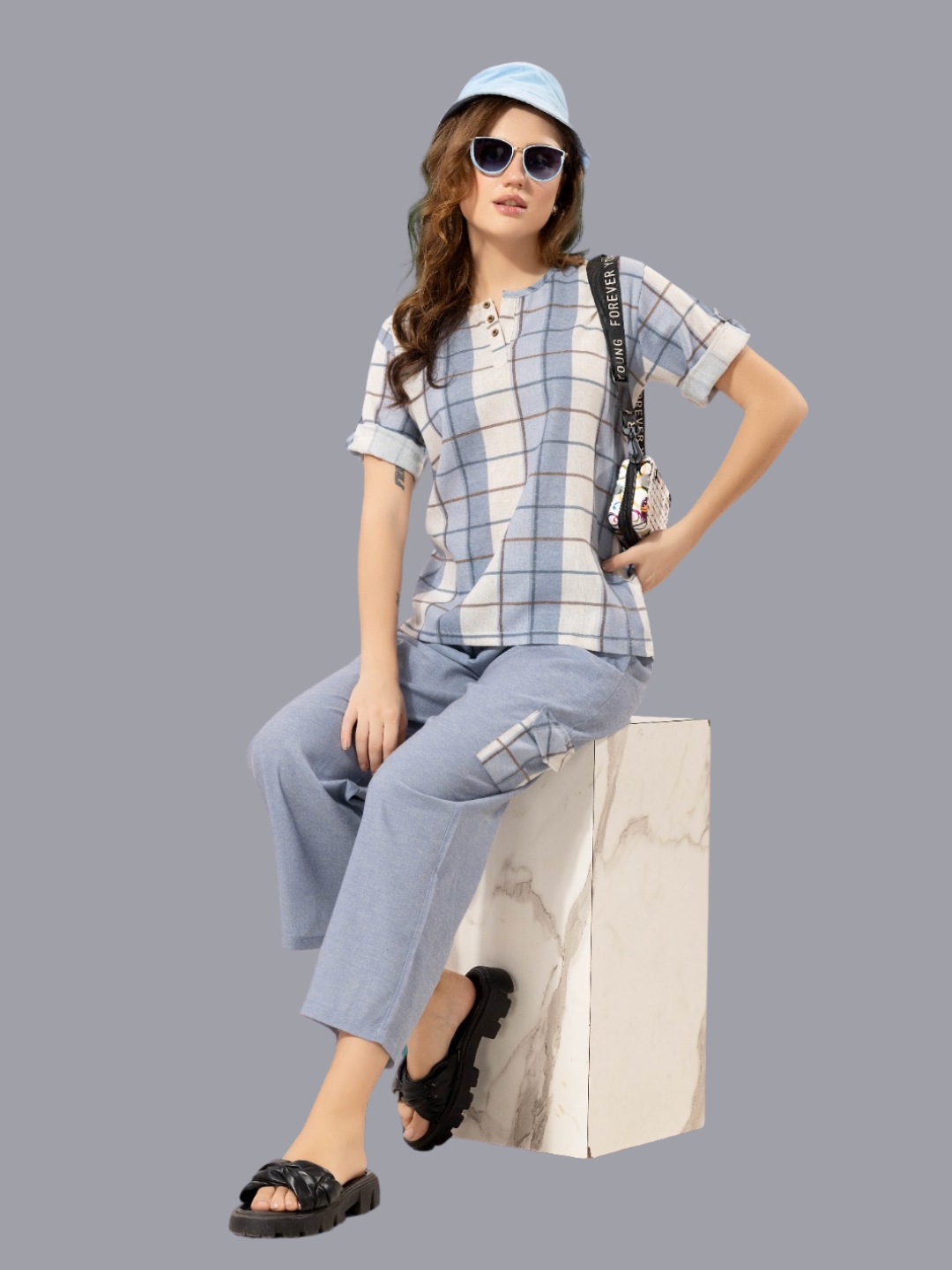A Blue checks T-shirt paired with mid-pocket plain Blue trousers is a fantastic choice for a coordinated and stylish outfit. The matching tones create a cohesive and trendy look that is both eye-catching and chic.