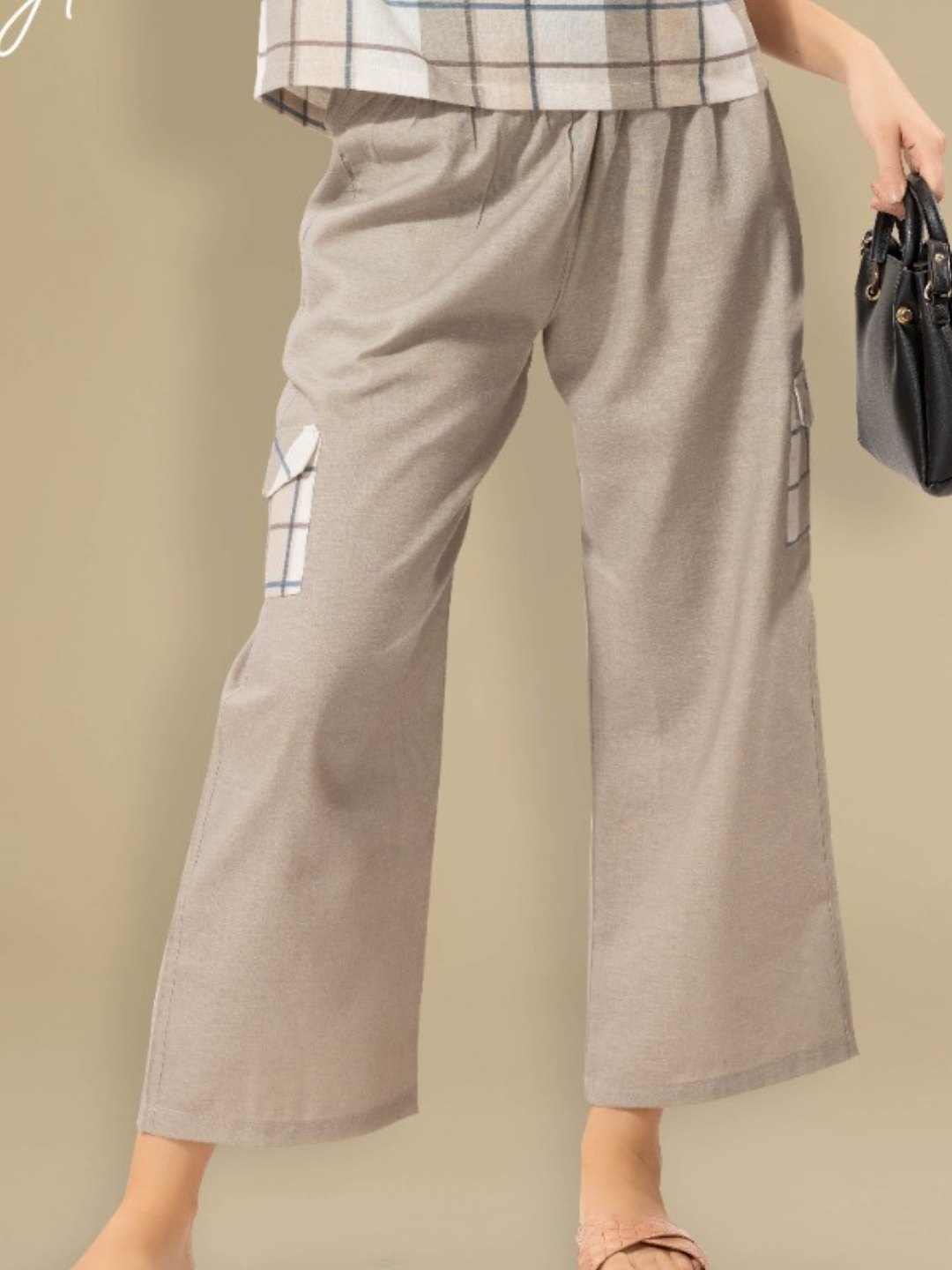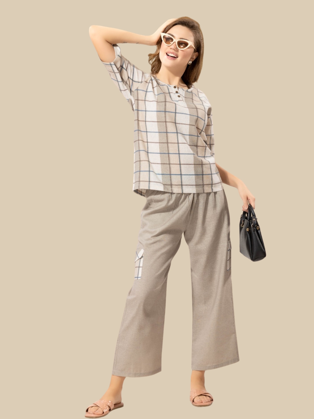 A plain checks T-shirt with a mid-pocket sounds stylish, especially paired with plain beige corduroy trousers. Its a classic and comfortable look thats perfect for a casual day out or a relaxed hangout with friends. Rock that outfit with confidence.