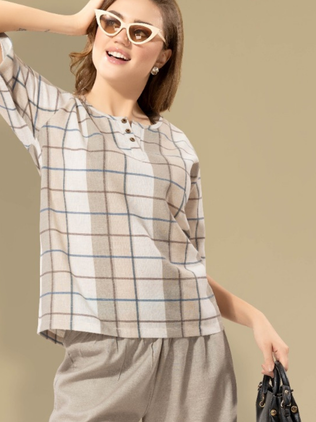A plain checks T-shirt with a mid-pocket sounds stylish, especially paired with plain beige corduroy trousers.