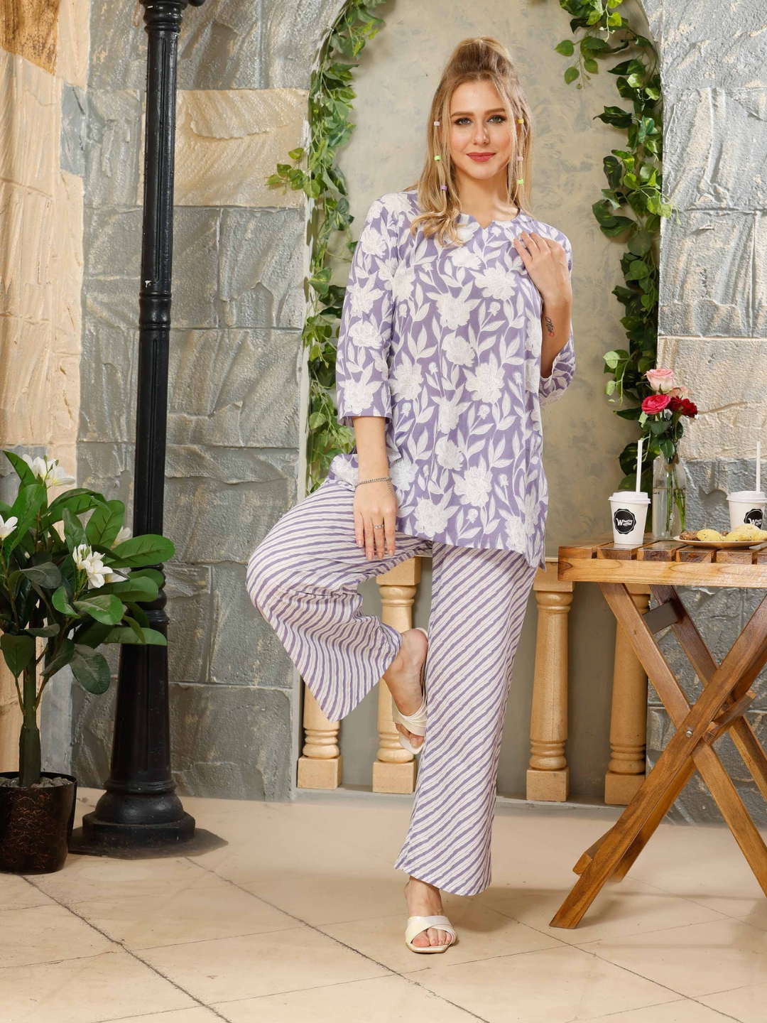 A blue leaf printed kurti cord set is a stylish and trendy outfit option. this set combines the elegance of the leaf print with the texture and warmth of corduroy fabric.