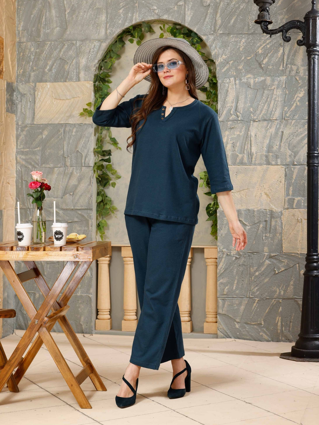 The combination of a comfortable T-shirt and matching trousers in a lovely blue color is perfect for lounging at home or getting a good nights sleep during the winter months. The corduroy fabric adds a nice touch of texture and warmth to the set, making it both fashionable and practical. Its the kind of outfit that makes you feel snug and relaxed while still looking put together. Perfect for those nights when you just want to unwind and feel comfy.