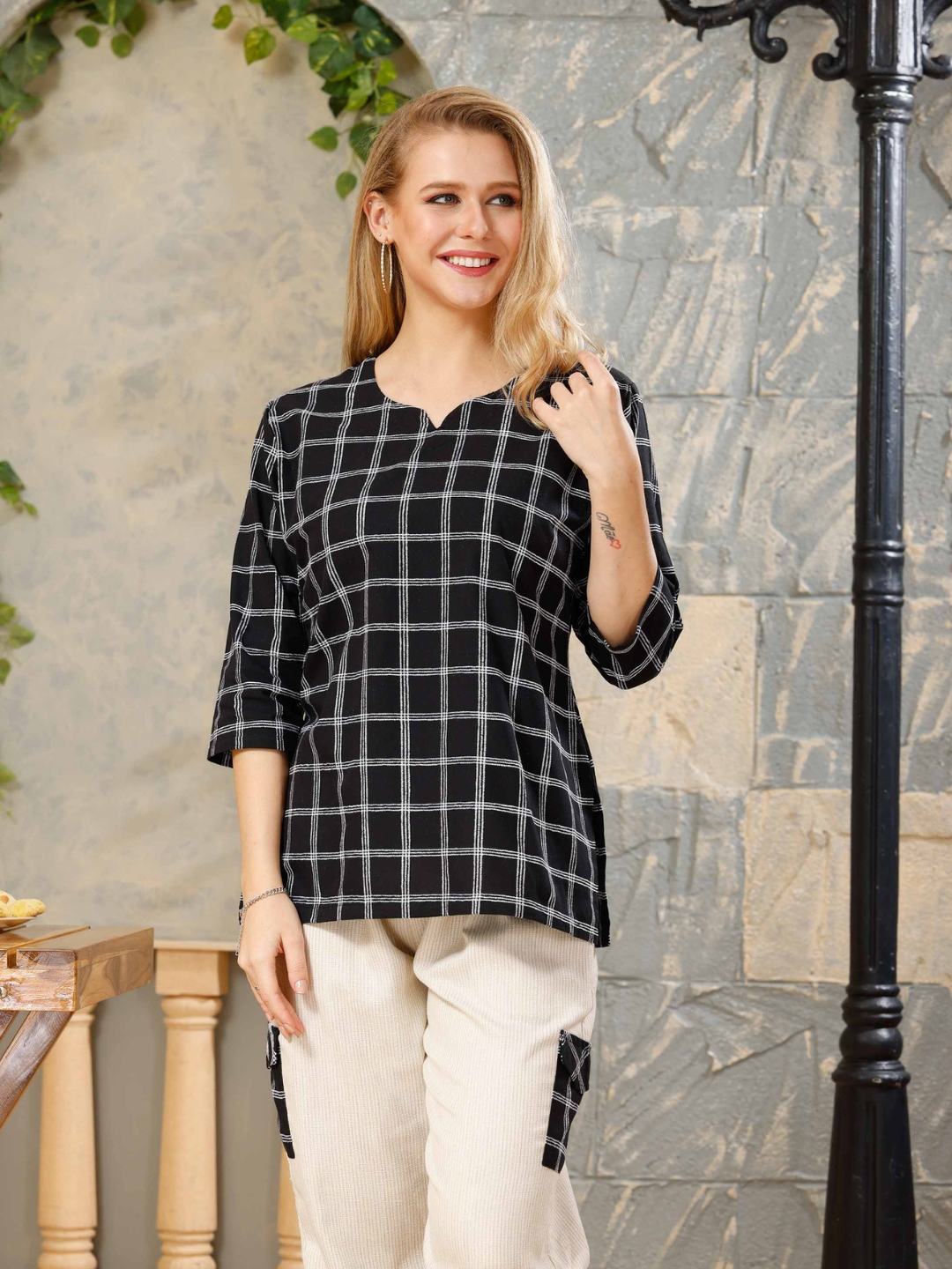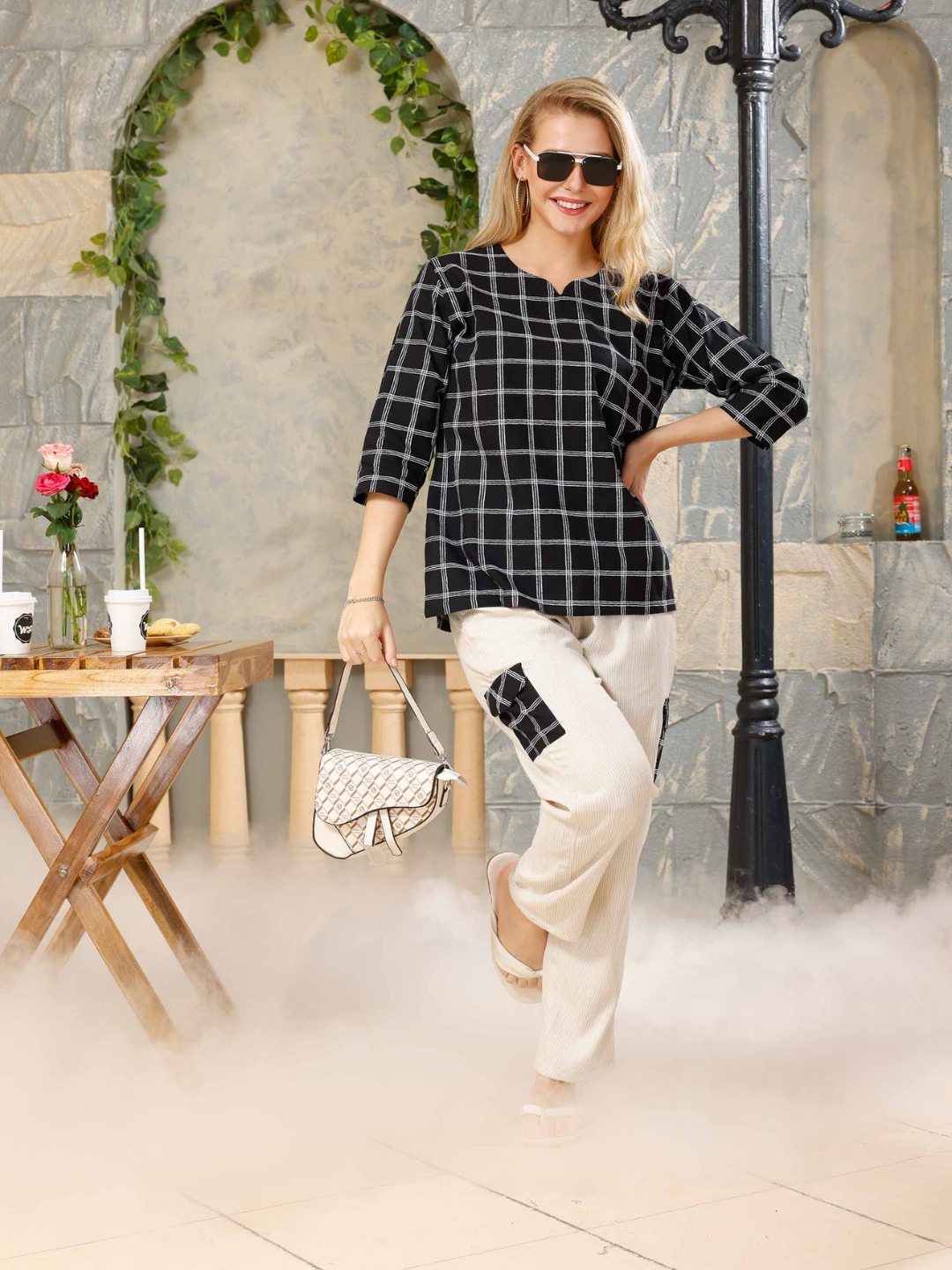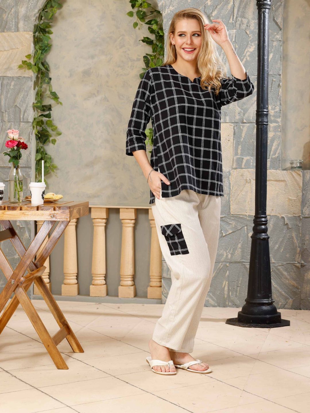A black color checks kurti paired with a plain white pajama featuring a mid-checks pocket sounds like a fashionable and unique combination! The contrast between the black kurti and the white pajama with a checks pocket can create a stylish and eye-catching look. The checks pattern adds an interesting element to the outfit. This ensemble is sure to make a statement and showcase your sense of style. Have fun flaunting this trendy outfit!