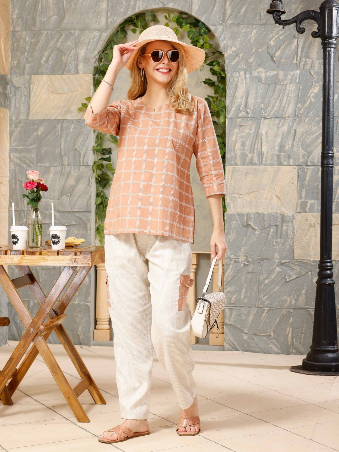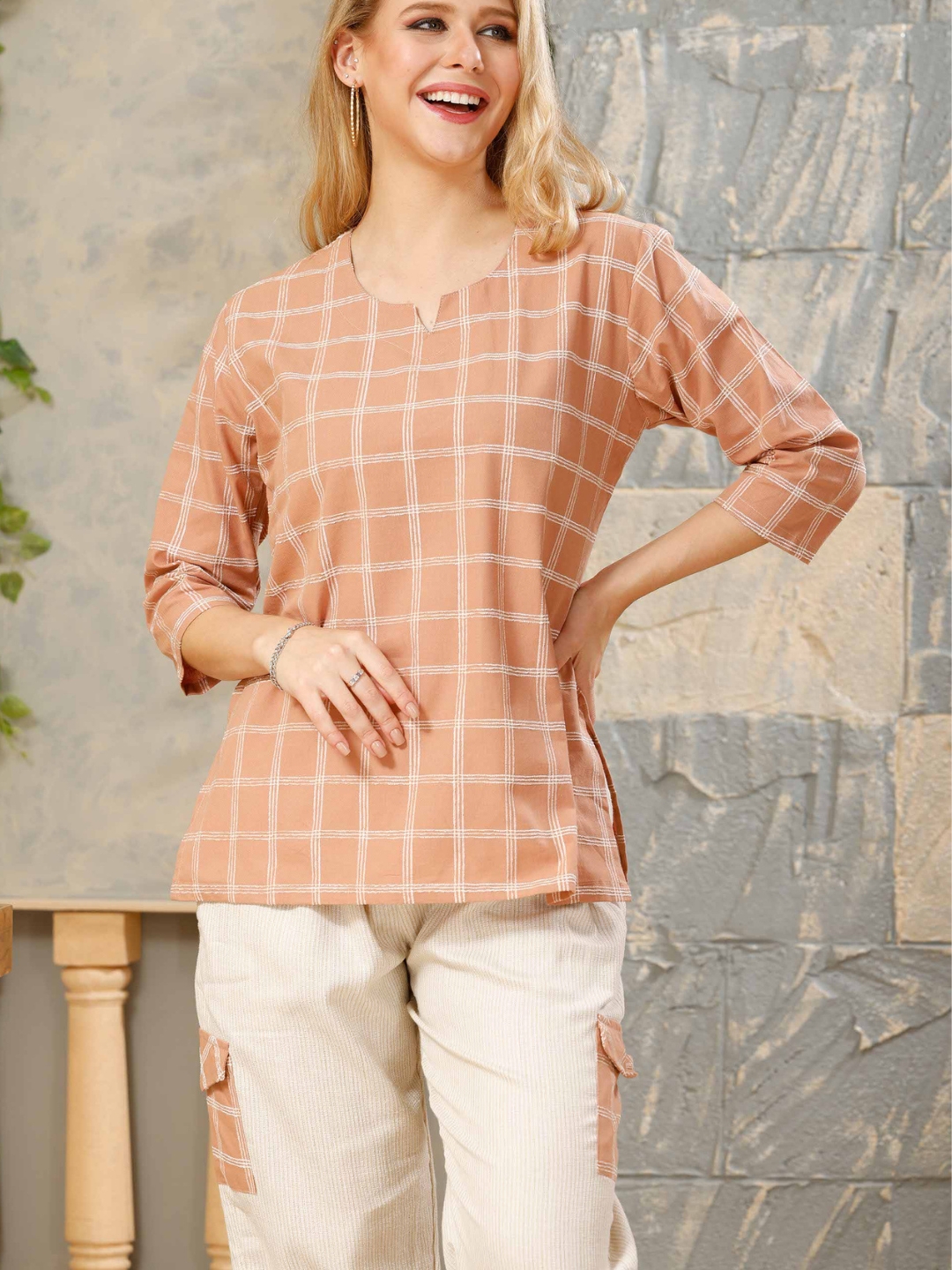 Orange checks short kurti sounds like a stylish choice! Checks patterns can add a trendy and chic look to a kurti. Its a versatile design that can be paired with different bottoms like leggings, palazzos, or even jeans depending on the occasion.