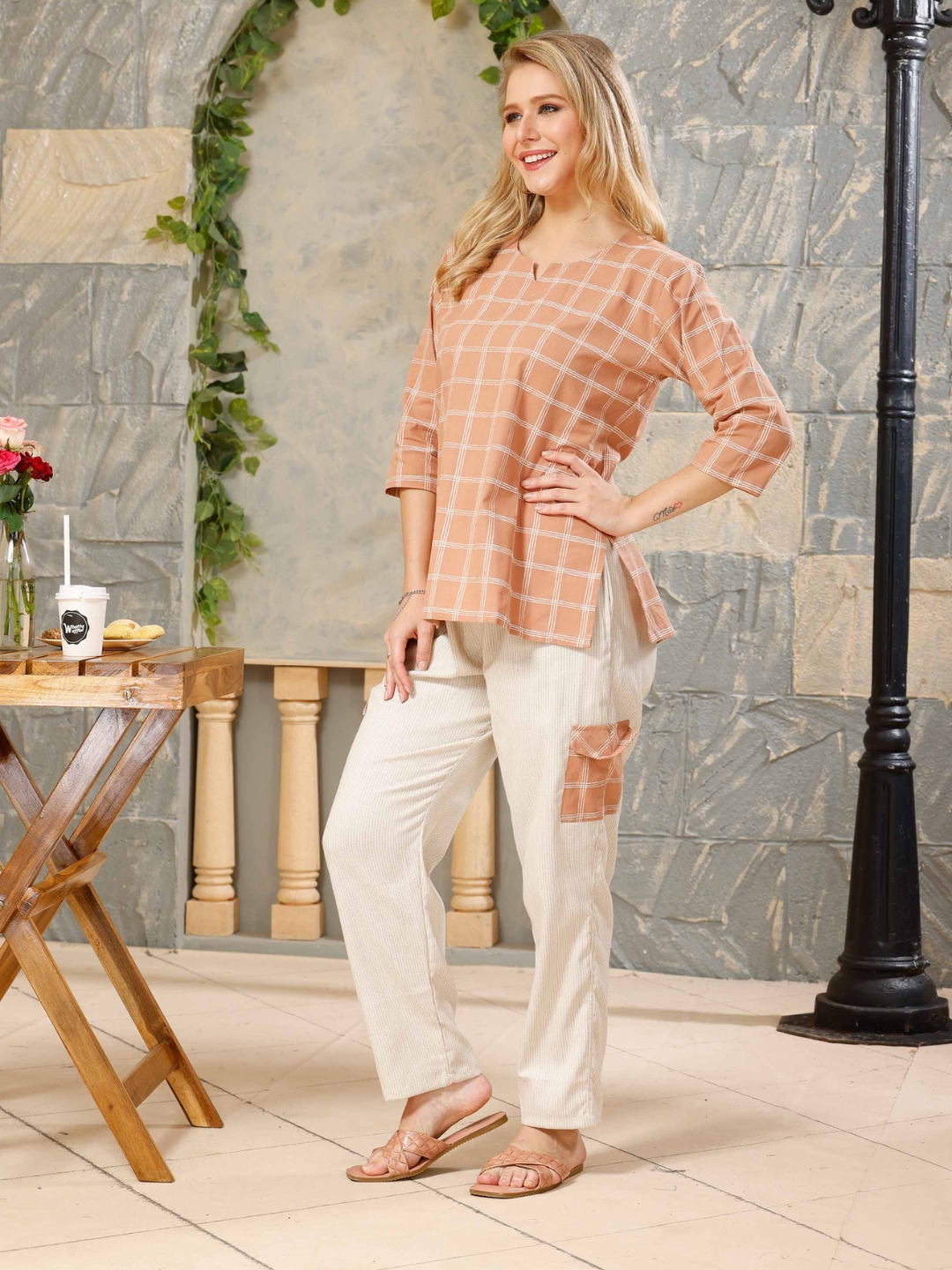 A Orange color checks kurti paired with a plain white pajama featuring a mid-checks pocket sounds like a fashionable and unique combination! The contrast between the black kurti and the white pajama with a checks pocket can create a stylish and eye-catching look. The checks pattern adds an interesting element to the outfit. This ensemble is sure to make a statement and showcase your sense of style. Have fun flaunting this trendy outfit!