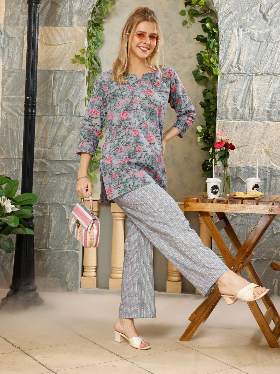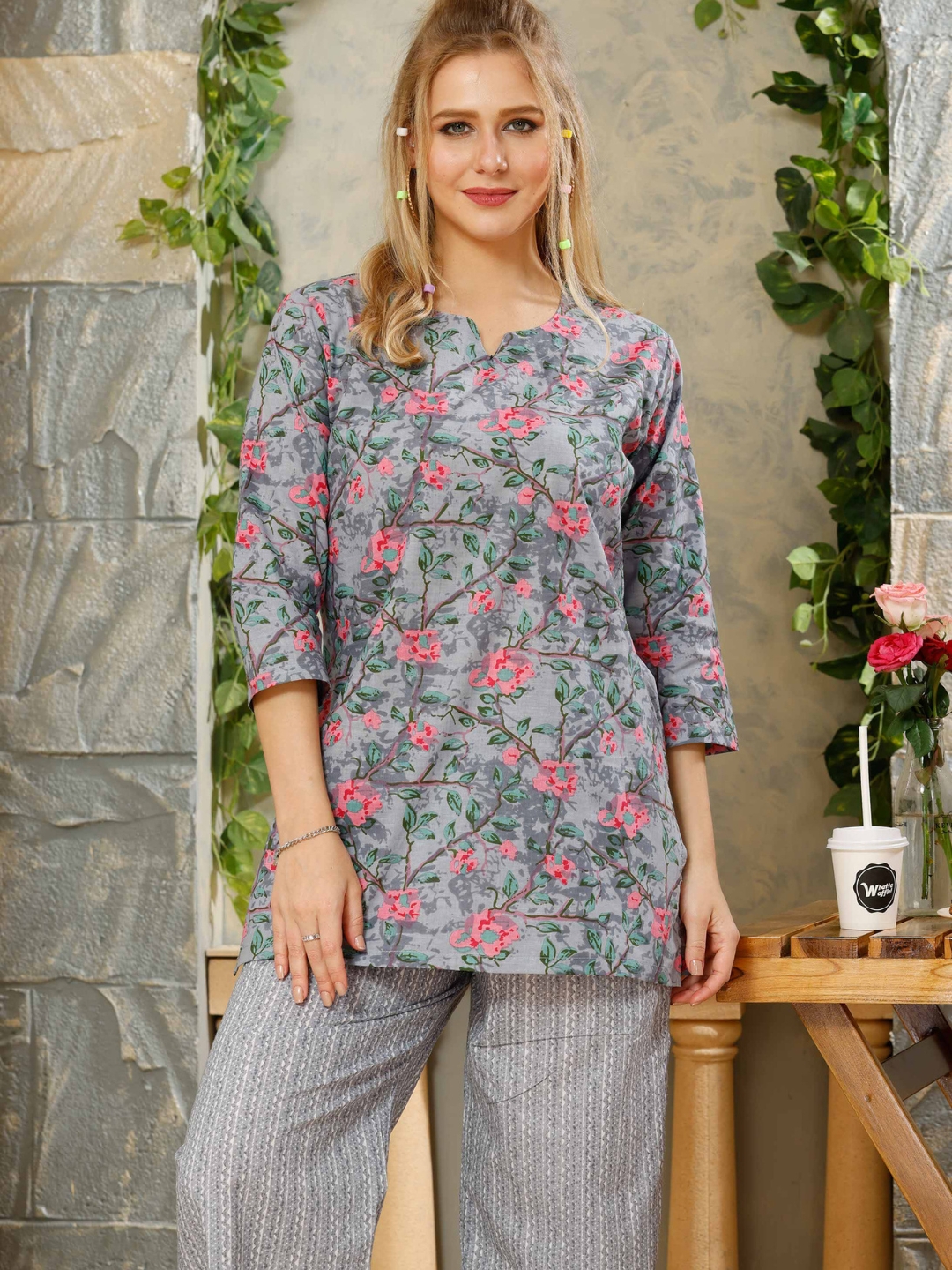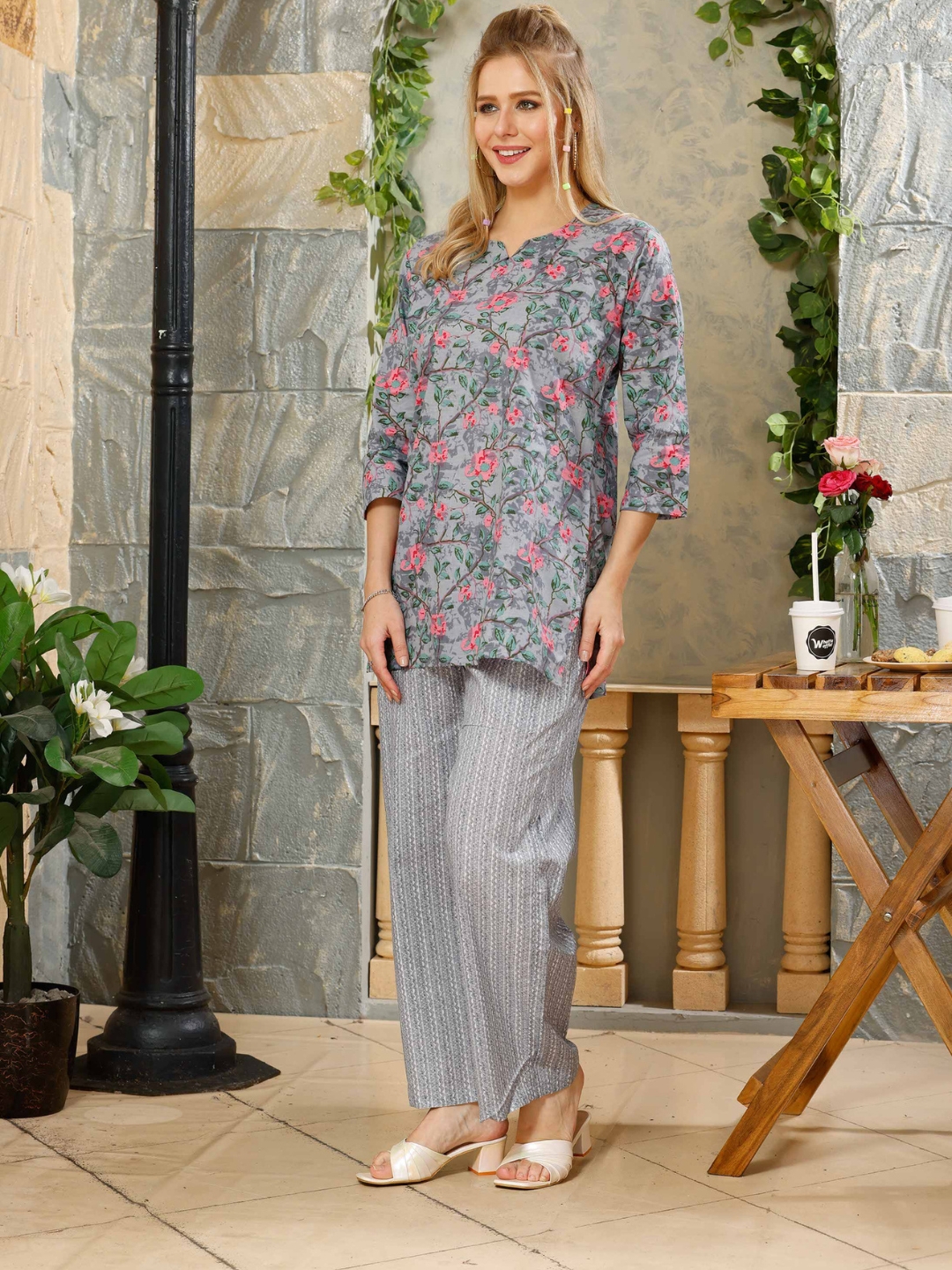 Stylish grey floral leaf-themed short kurti, beautifully complemented by a matching pajama cord set. The kurti features an elegant floral leaf pattern that adds a touch of nature-inspired charm, while its relaxed fit and breathable fabric ensure all-day comfort.