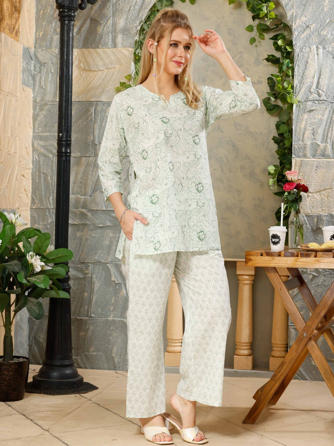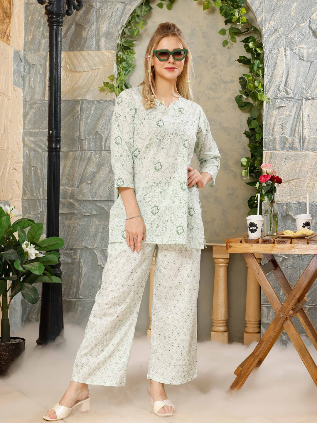 Pastel green floral leaf-themed short kurti, perfectly paired with a matching pajama cord set. The soft pastel green hue creates a serene backdrop for the delicate floral leaf patterns, evoking a fresh, nature-inspired vibe.