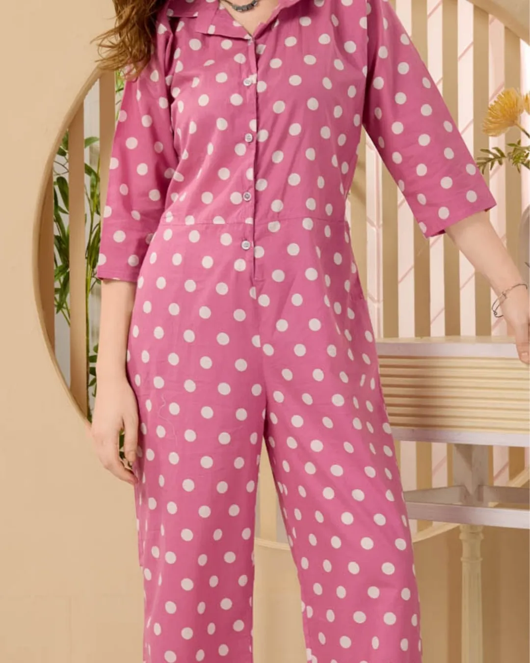 At our nightsuit company, we believe in providing jumpsuits that cater to all body types. Our diverse collection is available in various sizes, ensuring a flattering fit for every individual. The jumpsuits are tailored with stretchy, flexible materials that adjust to your body, offering a snug yet breathable fit for a restful sleep.