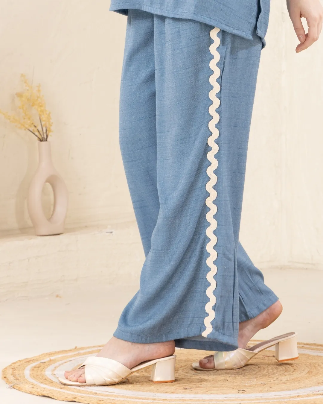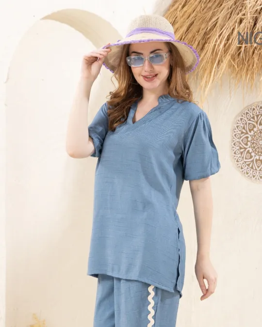 Crafted for women who love understated elegance, this royal yet simple three-fourth sleeves short kurti and ankle-length palazzo set in 100% premium cotton fabric is the epitome of timeless fashion. The kurti features a clean, straight-cut silhouette that flatters every body type. The V-neckline with contrast piping adds a refined touch, while the three-fourth sleeves with minimalistic lace edging enhance its grace. The kurti’s lightweight, breathable cotton makes it an excellent choice for year-round wear, ensuring both comfort and sophistication.