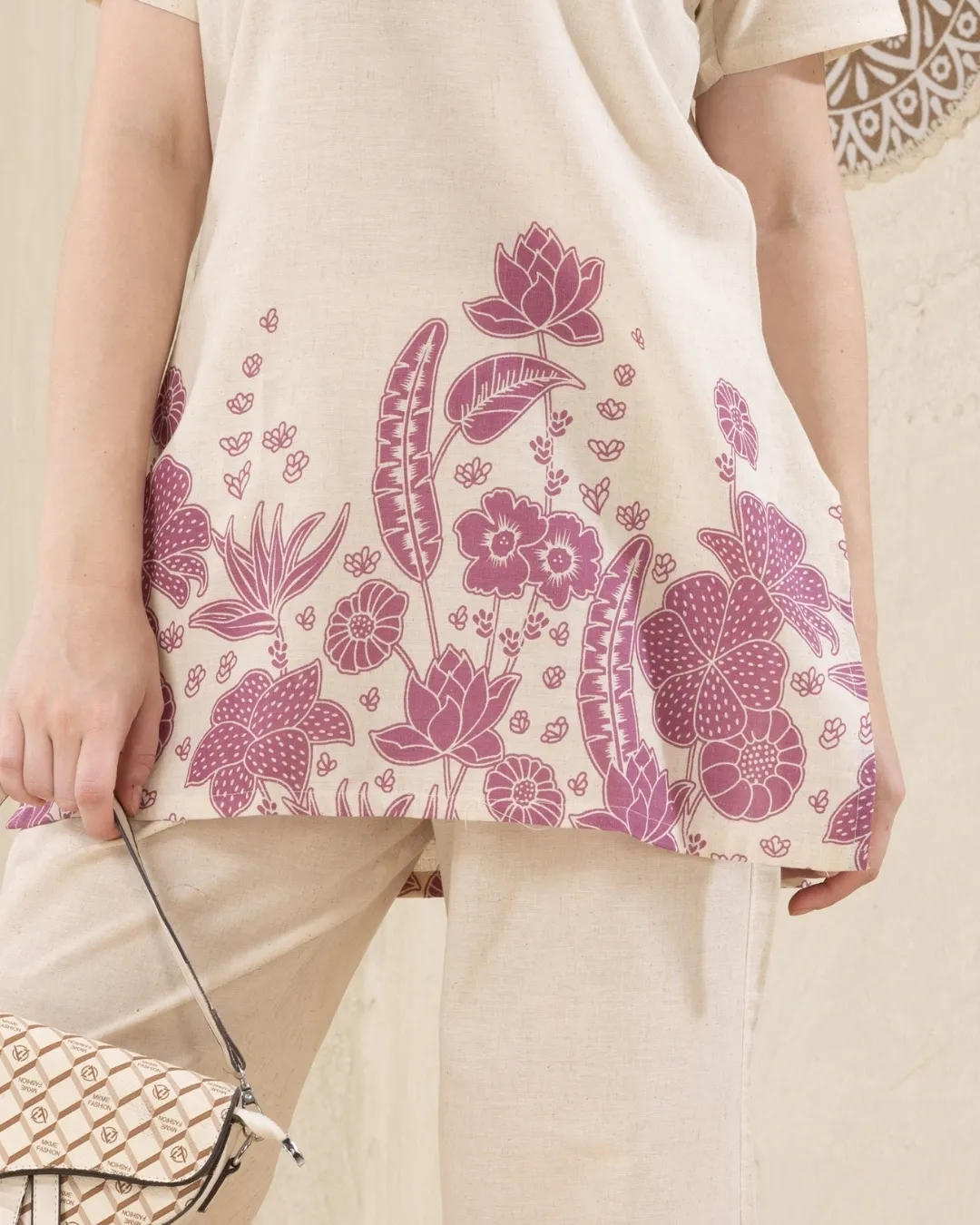 The kurti features a straight-cut silhouette with delicate wooden button detailing on the front, enhancing its contemporary appeal. The palazzo comes in a matching hand-block print design, creating a beautifully coordinated look. Its wide-leg design allows for airflow, making it a great choice for all-day wear.